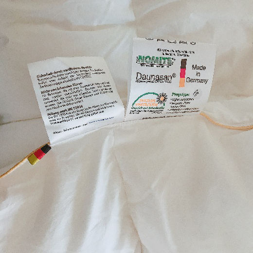 外包装采用的大概就是产品介绍里所说的德国DSD环保绿点认证的可回收无纺布,正面是透明的,可以清楚的看到装在里面的鹅绒被面料以及左上角的商家标签,背面则是深蓝色的无纺布,很简约。