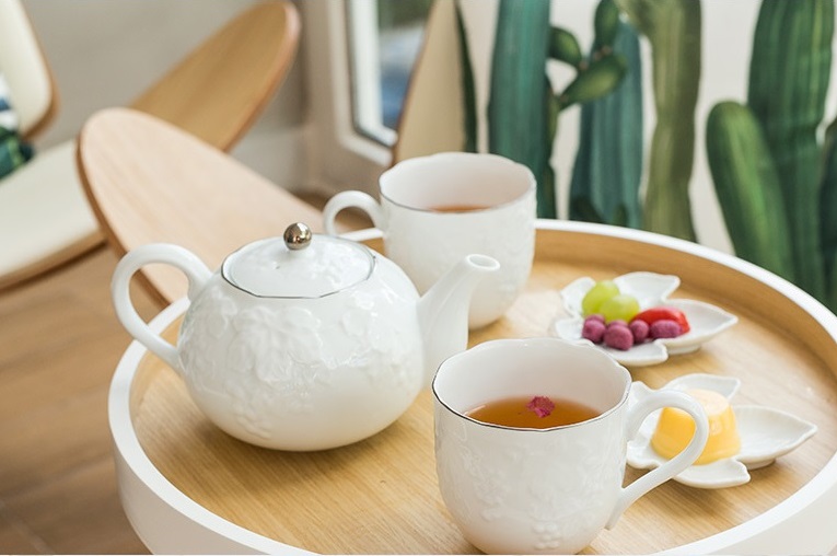 陶瓷材质的马克杯,其显著的特点就是热绝缘、导热性差,所以用起来方便不会烫手,款式色彩较丰富,陶瓷彩釉美观时尚,不管是多彩新意的马克杯,还是素雅淡静的纯白都深受很多年轻人的喜爱。这款纯白镶着银边带着浮雕刻花的的AITO美浓烧陶瓷茶壶马克杯餐碟5件套装,出自日本著名的婚纱设计大师桂由美之手,设计风格浪漫纯洁,使得茶壶马克杯显得优雅美观,典雅大气,给人赏心悦目、心旷神怡的感觉,不管喝茶还是热饮都成为一种舒适的享受!