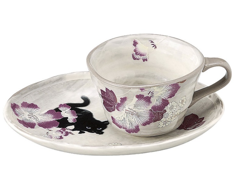同是抚松庵系列的这款芙蓉与猫的茶杯茶盘,杯套的意境极好,深色芙蓉花开,一只黑猫闯入视线,正伺机行动,深邃灵动的眼睛栩栩如生,有些俏皮又有些小妖艳,似乎下一步就要跃起弄花了。