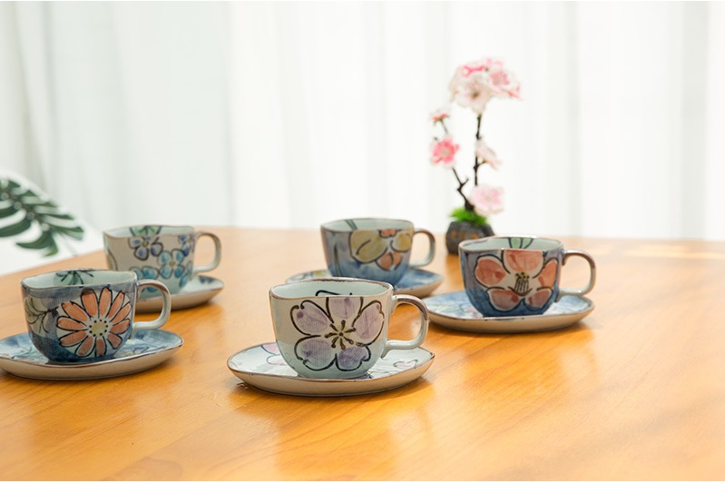 最后我们再来看一款精美文艺的濑户烧陶瓷茶杯咖啡杯套装,淡淡的蓝晕染开来,手绘的温情绽放在陶土质朴的风味之中。花色各异的五组茶具,美妙有趣,釉料颜色丰富而温和,质感扑面而来。让生活充满了艺术气息!