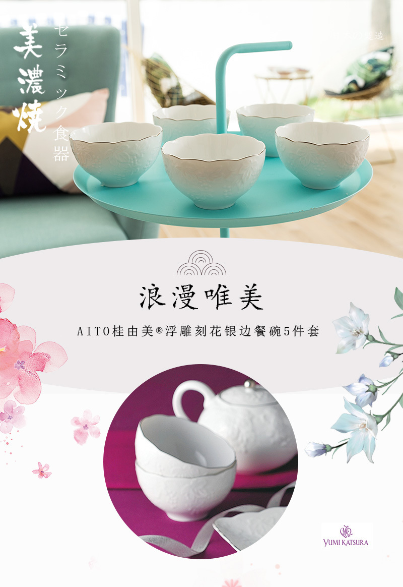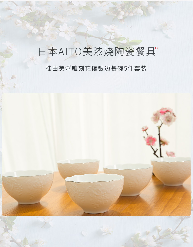 | 商品名称 | 日本AITO桂由美美浓烧陶瓷葡萄刻花纯白银边餐碗5件套 | |