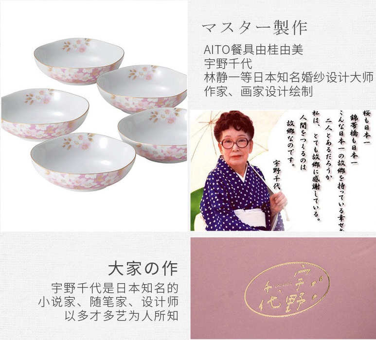 | 功能特点 | 宇野千代是日本知名的女作家,以多才多艺为人所知。 她的本系列作品以淡淡的粉樱为主题,点缀以细细金色的镶边, 如此生动娇美,惹人喜爱。 |