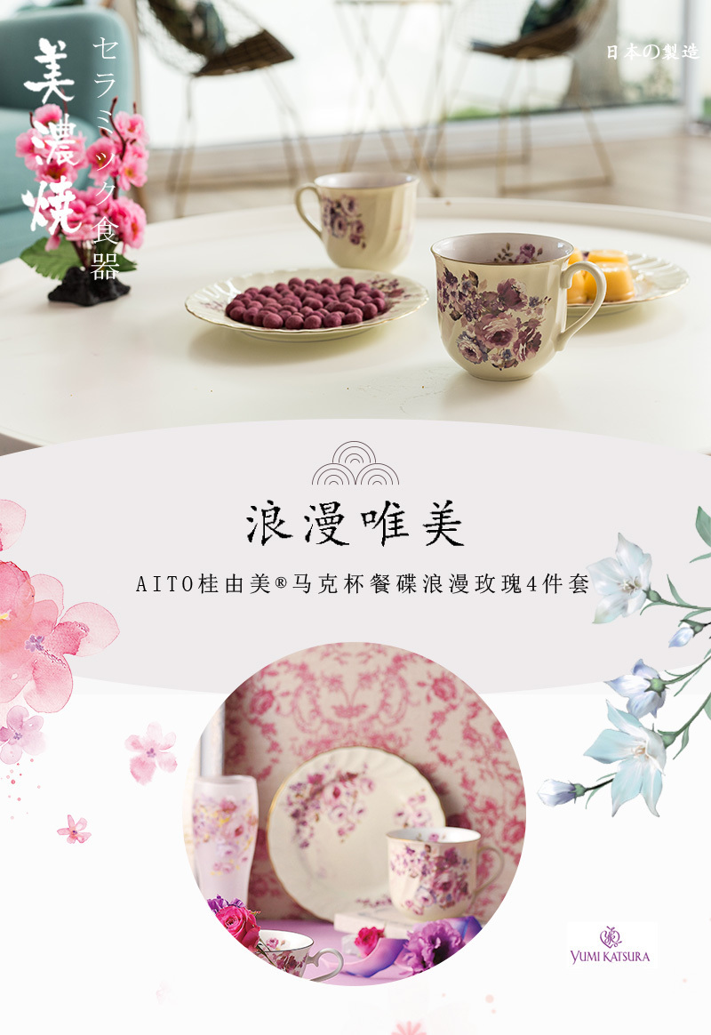 | 功能特点 | 梦幻玫瑰将西式浪漫与东方情愫融合在一起。 被日本政府认定为“日本国家传统工艺品”的美浓烧陶瓷 特色鲜明、样式精致、安全无毒。 本品也非常适合作为新婚礼物。 |