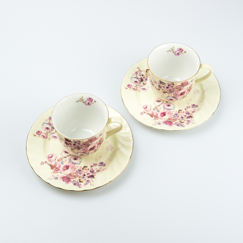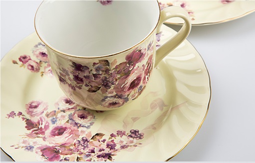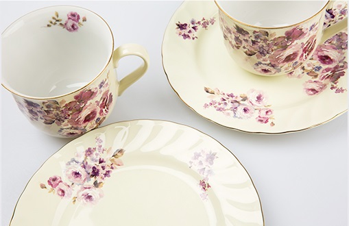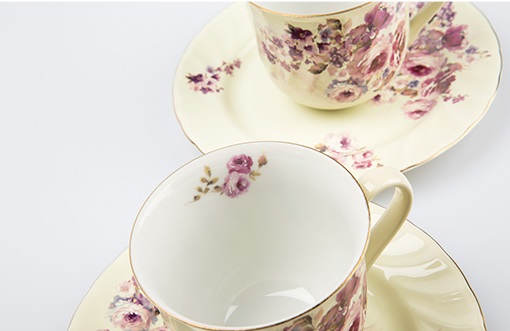 浪漫高贵 柔和的浅黄与 怒放的玫瑰 杯体与碟面遥相呼应 |